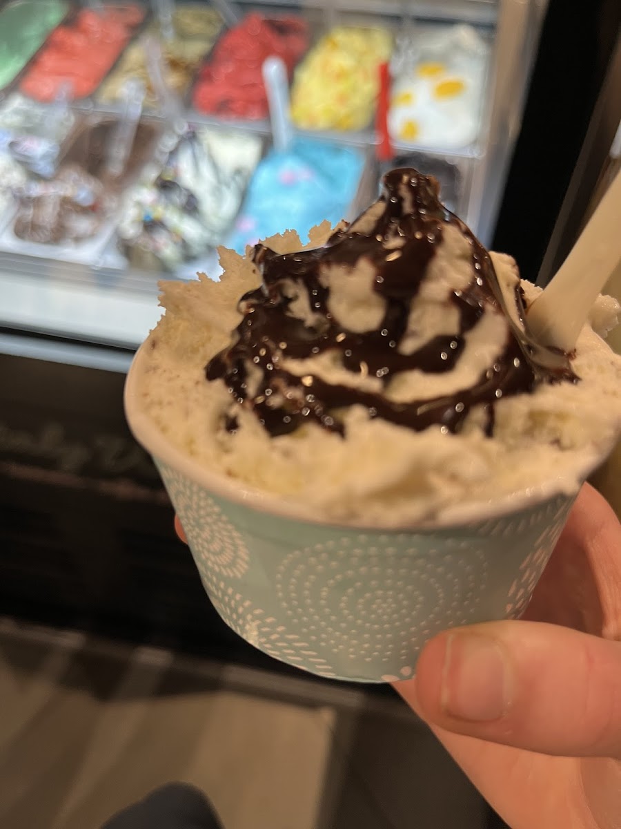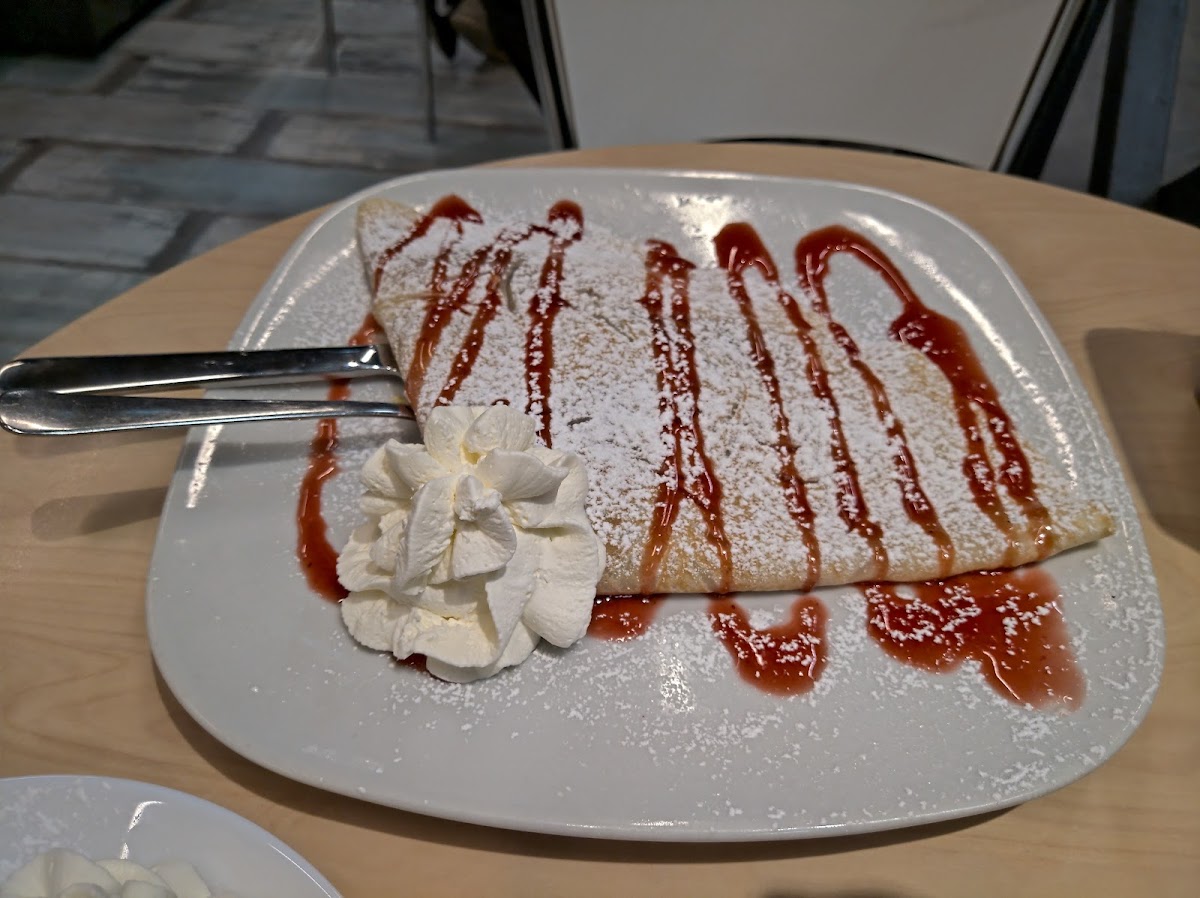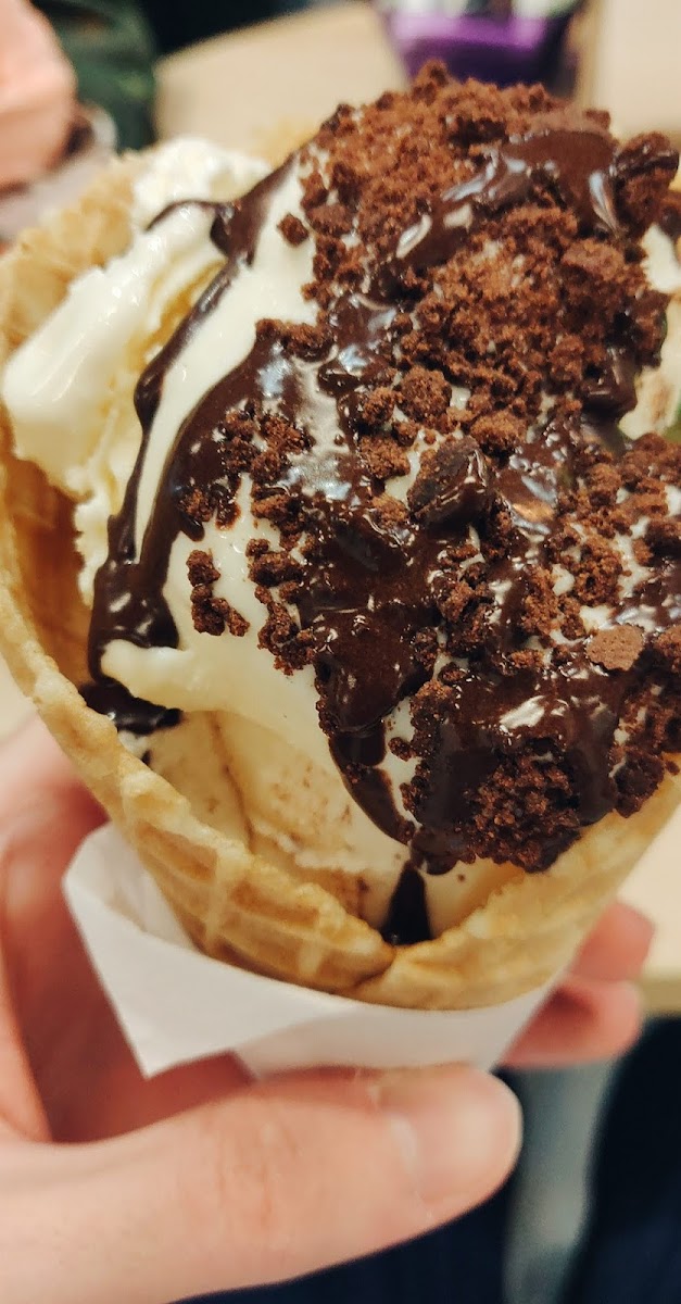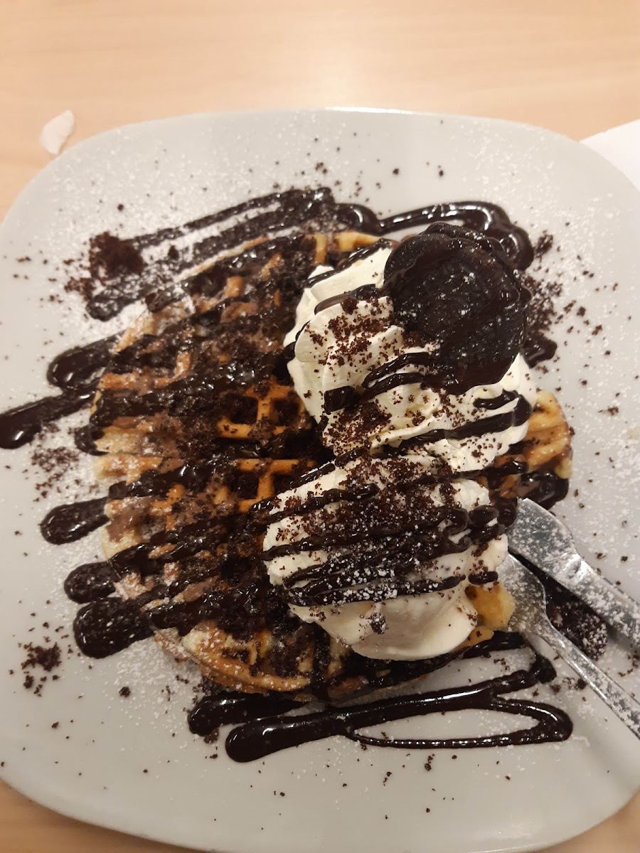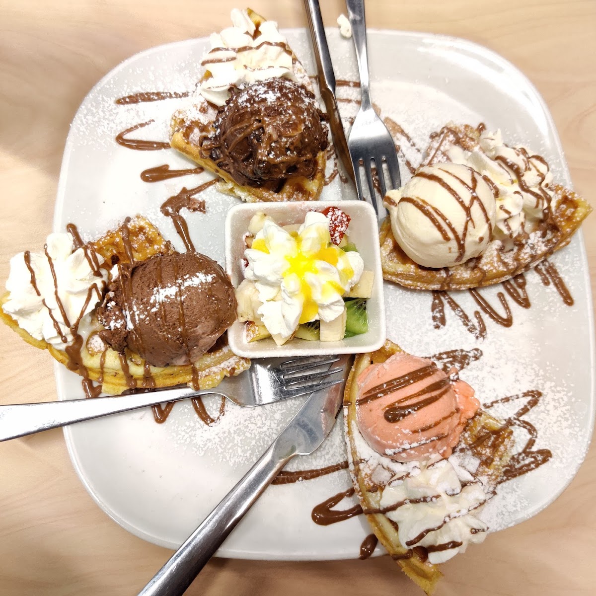 So sweet! Went there with my boyfriwnd on his birthday. We had 2 person icecream serving and it was lovely. We could choose all the 4 flavours and had so much real wippedcrean one could want He had a pistachio coffee and loved it everything looked delicious but we couldn't eat anything after that waffle